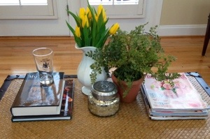 You’ll notice my table top has two similar stacks of books/magazines. But then I added height and texture with the faux potted plant. The white pitcher of tulips doesn’t always live here, but it adds additional color and texture.