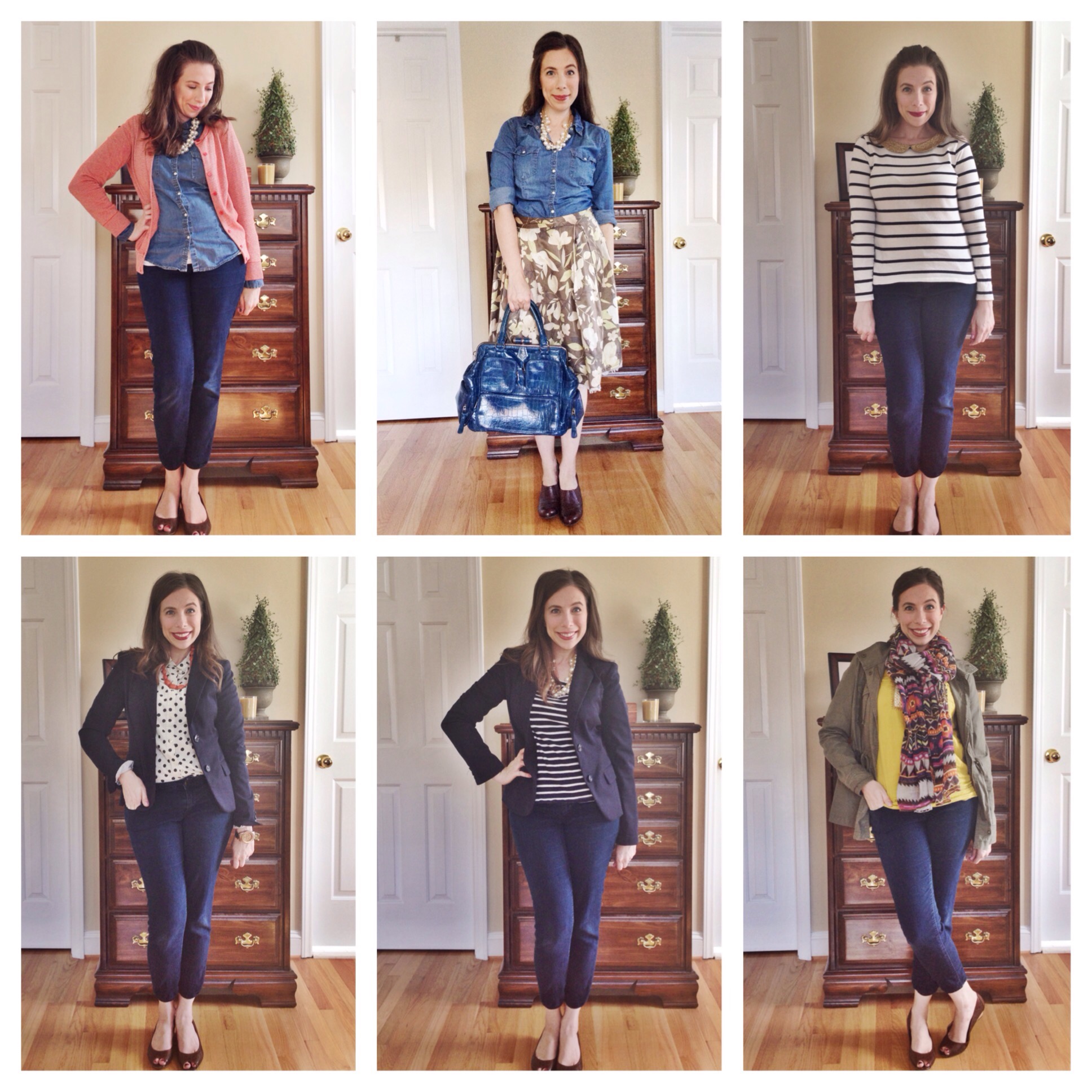 I like all the repeating – big reality of my work-from-home mom life is jeans and I pretty much wear the same pair over and over. You made a good variety of outfits with them though! All polished, but a good mix of more casual and more dressy. Love #6.
